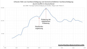 Die politischen Aktivitäten führten im Jahr 2005 zu einer Ergänzung der Sachbeschädigungsparagrafen des Strafgesetzbuches (§§ 303, 304 StGB). Bestraft werden kann nun, wer das Erscheinungsbild einer fremden Sache oder einer Sache mit öffentlichem Interesse nicht nur unerheblich und nicht nur vorübergehend unbefugt verändert. Eine explizite Aufnahme des Begriffs „Graffiti“ in den Straftatbestand – wie von einigen gefordert – erfolgte nicht. Nach der Strafrechtsverschärfung stieg die Anzahl der erfassten Fälle von Sachbeschädigung und Gemeinschädlicher Sachbeschädigung bis zur Änderung der statistischen Erfassung im Jahre 2008 weiter stark an und pegelte sich ab 2013 in der Größenordnung von ca. 100.000 Delikten pro Jahr (und damit weit über der Anzahl im Jahr 2000) in Deutschland ein. Die Aufklärungsquote erreichte 2010 einen Spitzenwert von 25,4% und sank bis 2024 auf den vorläufig niedrigsten Wert von 13,0%. Die Anzahl nichtdeutscher Tatverdächtiger betrug 2011 8,4% und stieg bis 2024 auf 13,7% an. Die Anzahl aller Tatverdächtigen sank von 13.634 (2011) auf 9.357 (2024), wobei der Anteil weiblicher Tatverdächtiger zuletzt 14,1% betrug.33)